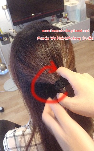 4.將扭轉髮束纏繞在原本的黑髮圈上,並以小黑夾固定此扭轉髮束