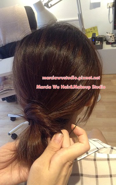 7.以這兩半的髮束打活結繞一個圓圈,並將這個結以小黑夾固定在頭髮上