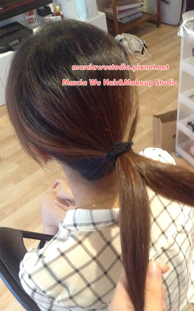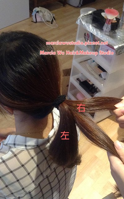 1.將頭髮綁一束,側面看與耳朵位置平行