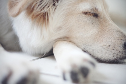 當狗狗呈現這樣睡姿時,表示牠現在不想被任何人打斷香甜的夢境,因此主人還是好好的讓狗狗繼續作美夢吧。