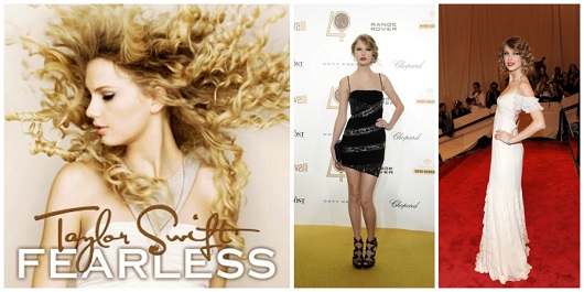 穿搭重點:優雅低領口,亮片條紋,鬆散捲髮2008年11月的第二張專輯《Fearless》,泰勒絲宣示自己長大了。這時期的她更漂亮,雪紡禮服或者亮片禮服顯示著她很了解自己的身材優勢。這時候的髮型較為鬆散,她常常以浪漫的小髮髻作為髮型重點。服裝多半少了過多的裝飾,乾淨的肩線和盤起的高髮髻展現她優雅的曲線,迅速讓自己成為鎂光燈焦點。