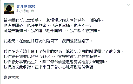 五月天的瑪莎今天在臉書坦承結婚,他在臉書分享喜悅,「希望我們可以牽著手,一起慢慢走向人生的另外一個階段。也許更開心,也許更甜蜜,也許更幸福,也許不一定,可是無論如何,我知道已經牽緊的手,我們都不會放開。」他去年5月與名媛設計師謝葦怡傳出戀情,他日前訪問表示想要定下來了,看得出來對這份感情很堅定,如今走入婚姻,粉絲都給予很多祝福,也成為五月天第三位人夫,如今的單身漢還剩下阿信與怪獸。