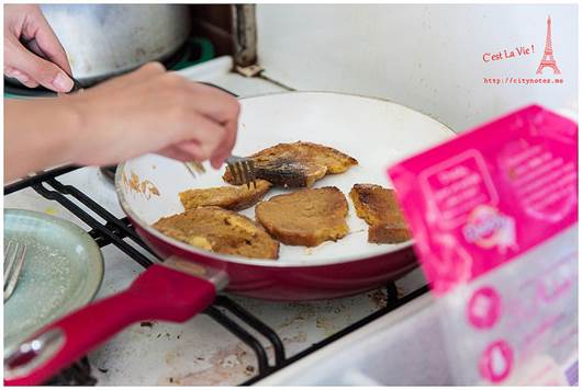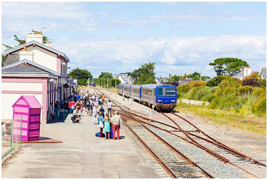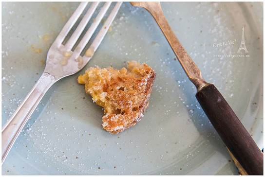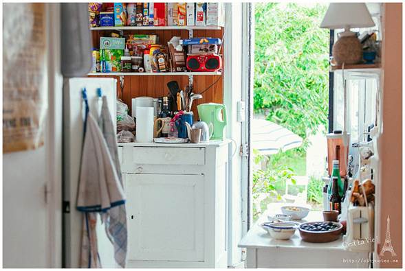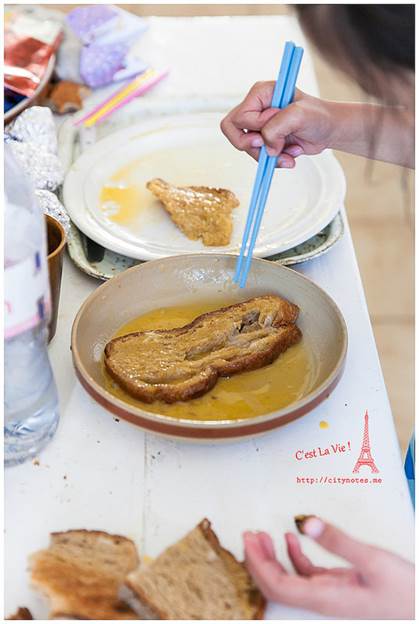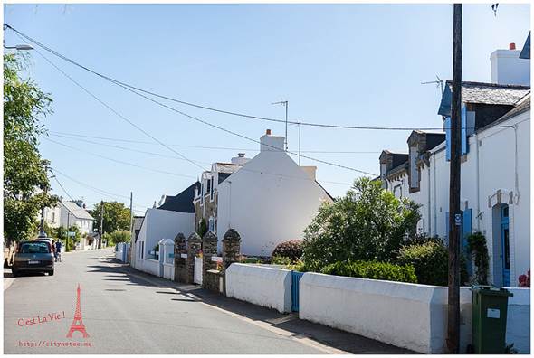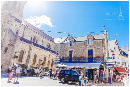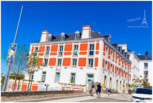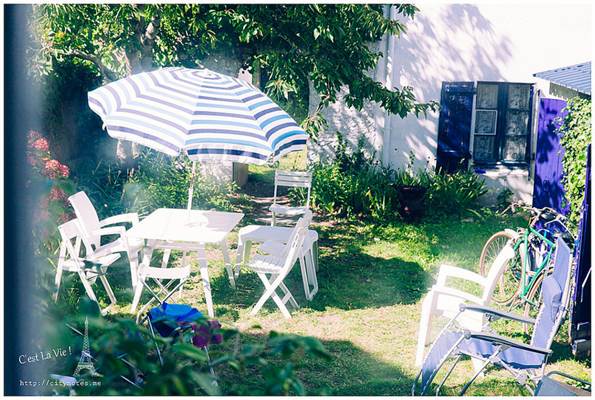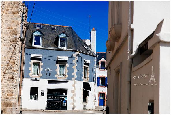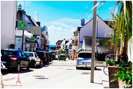可是一點「法式」的意思都沒有呢!Pain是麵包,perdu是毀了、浪費了的意思,簡單地說就是麵包回收再利用。法國氣候乾燥,麵包一兩天就乾掉不能吃了,這種方法可以延長食用時間,變得更花俏後,也深得小孩子的喜愛。做法就是打三顆蛋,參砂糖與少許麵粉,把硬硬的麵包浸軟後,放進平底鍋煎。(要放油唷!)起鍋時,再撒一些砂糖上去,微焦的Pain perdu有濃郁雞蛋的香氣,十分好吃!每當我喝著餐前的cidre(蘋果酒)看著廚房外的花園,都會陶醉地說:「C’est La Vie ! 」房東太太看我一臉好笑,直說有沒有這麼誇張?布列塔尼生活慢調子,卻處處驚喜,靜下心來,再慢一點,生活藏在細節裡。Quiberon是個寧靜的小鎮,大多是白人,黑人很少,黃皮膚又更少了。有時候,真不太能確定眼前的布列塔尼Bretagne是不是一幅畫。通往海邊的熱鬧小街。隨便一棟房子,都有百年歷史。這棟是地方政府,對面是遊客中心。好喜歡這張桌子!愛的無限迴圈。這段從AURAY到QUIBERON的小火車又被當地人稱作「Tire-bouchon」,意思就是「拉開軟木塞」,為什麼這段小火車跟軟木塞有關呢?因為布列塔尼Bretagne由北島與南島組成,中間以一條極窄的路連接,小火車經過這條窄路,豁然開朗的過程,就像拉開酒瓶的軟木塞般,是一個形式,也是一種心境吧我想!這可以證明,法國人多愛喝酒,什麼都可以想到酒。(笑)