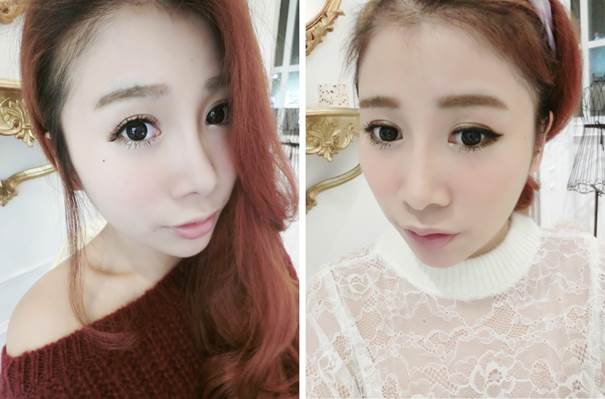 下圖左:上眼線液的部份,我只有加強眼尾而已,沒有厚重的眼線液讓眼褶看起來更明顯,然後下睫毛的部份,只使用了HR睫毛膏,整個妝看起來較乾淨清爽!下圖右: