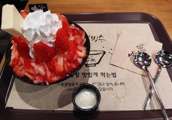 阿米果本人超想吃花生麻糬雪冰,但是因為「皮諾丘」效應我還是忍不住點了限定版, 11月底才推出的生草莓雪冰(韓幣12000) ,視覺效果極佳,附上兩支湯匙是方便你翻攪,一個人吃也是給兩支,並且讓客人自己淋上煉乳,不惜成本的可以續煉乳呢,常看韓劇的人應該都知道韓國人越冷越吃冰的療法,夏天吃蔘雞湯冬天吃冰,不管是零下幾度,因為室內有暖氣冰店還是高朋滿座,而且雪冰本身口感鬆鬆的,並不是真的那麼冰難入口,最後離開前還有熱茶提供給客人,「雪冰」真的是超貼心商家,最近要去韓國的朋友不要忘記去吃喔!雪冰官網:http://sulbing.com/❤FB粉絲團:阿米果‧首爾熱血趴趴go你可能想看: