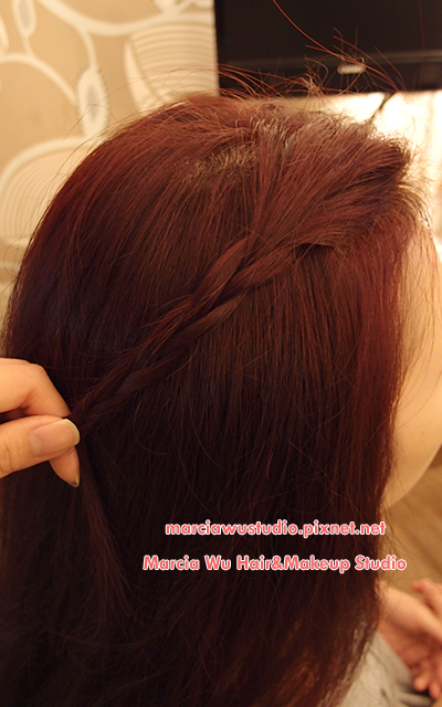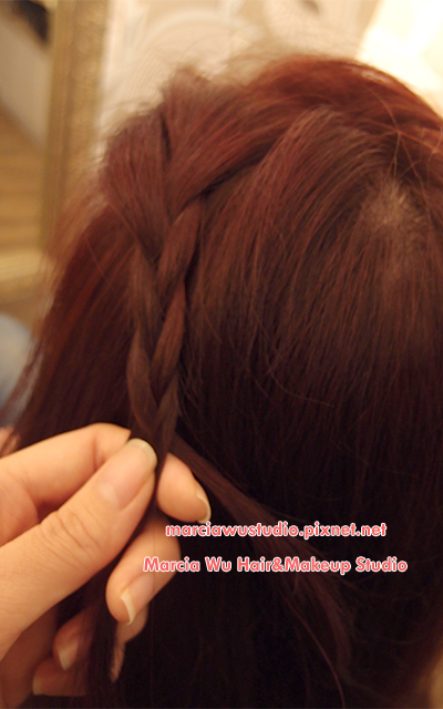 接著將此髮束編三股編,此部分無須加編,用原瀏海髮束編三股編即可。