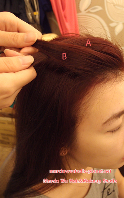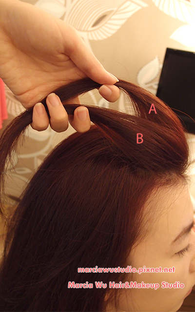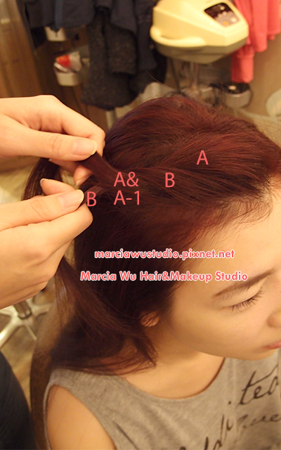 髮束AB互相纏繞後,接下來取瀏海區旁的髮束A-1。