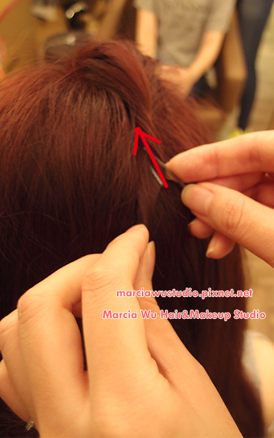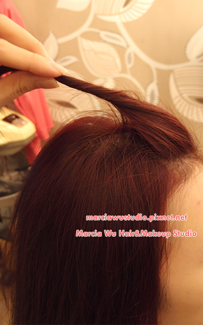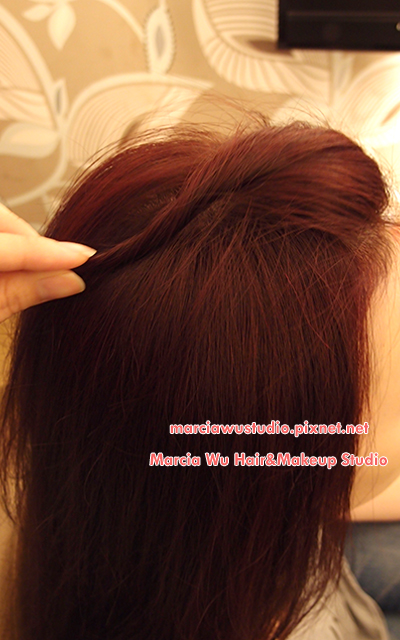 接著將中分右側部分,頭髮的瀏海三角區塊取一髮束。