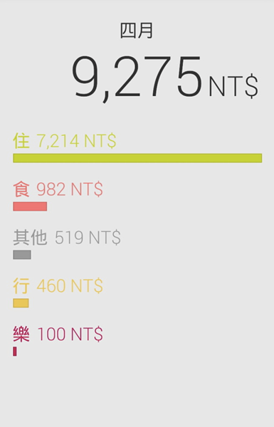 1. 簡明的分項目,一覽本月的各種類花費: