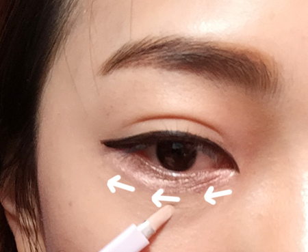 第一是用比膚色深的A色,塗在最靠近眼睛部分的地方(黑眼圈的最深處),像箭頭那樣化。