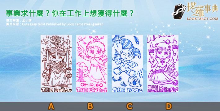 很多人說工作不就只是為了溫飽?你也是這樣想的嗎?還是在工作中,你可以努力以赴穫得成長,更進一步在工作的過程中,學習到重要的人生道理,甚至於可以影響著你未來的人生價值觀呢!想知道現在的你,在工作上想追求的是什麼嗎?現在就跟隨你的直覺,請依照你的第一印象,選一張你最喜歡的塔羅牌吧!選A的你:工作上想要『掌控權』 權力,一直是你在工作上想要獲得的一項目標,因為對你來說,很多事情只要有了權力,做起來都會得心應手,在工作上十分有能力的你,喜歡面對很多不一樣的挑戰來讓自己成長,能努力以赴突破困境也是你很棒的特質,千萬別被外在的職位名稱給迷惑了,真正的功成名就看的是你自己的長遠發展,權力是一時的,能力才是永遠的!選B的你:工作上想要『好人緣』 工作對你來說,環境是最重要的,能安定的好好工作,就是你想要追求的工作模式喔!如果工作上能遇到好同事,那就是一件十分幸運的事喔!凡事以和為貴的你,一直都能跟事業上的伙伴們保持一個良好的關係,這也讓你在工作中穫得很多的幫助喔!如果你身邊有這樣的好同事,就要請你好好珍惜這樣的情誼,相信未來也會變成知心好朋友的喔!選C的你:工作上想要『成就感』 在工作上想要發揮天馬行空想法的你,最想要穫得的就是成就感了,這種有時候來自別人的肯定與鼓勵,也有時候是一種自我作法的成果體現,無論如何,目前對於工作上有著滿滿熱情的你,任何事物都願意去體會嘗試,因為在工作上還有很多未知的部份,對你來說都十分有吸引力,盡量的往前邁進吧!相信自己一定會有很多好成果的!選D的你:工作上想要『賺大錢』 你的工作目標其實很清楚,就是賺錢!你已經在心中訂下一個目標,要在幾歲之前想要賺到人生的第一桶金,所以在工作上你不怕累、不怕苦,只怕薪水太少。做起事情來十分有幹勁的你,其實都讓老闆主管們發現你的優點了,當然除了努力以赴之外,也要特別小心自己的身體健康與心裡情緒,還是要有舒發的管道,休息才能走更長更遠啊!圖片來源:夢幻樂園塔羅日誌