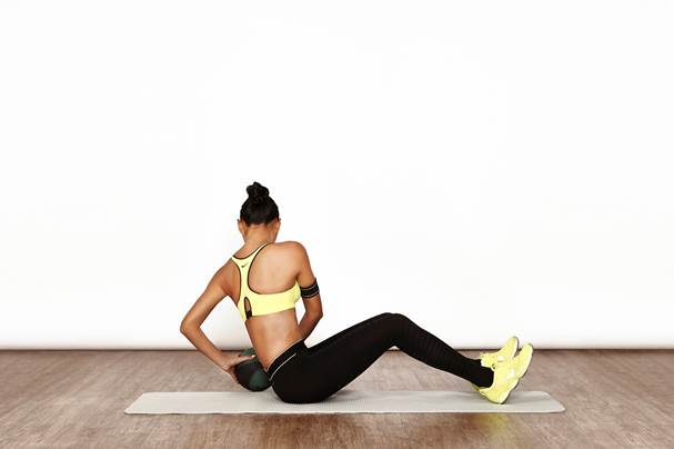 右側腰部用力,使臀部離開地面,屁股向上推。