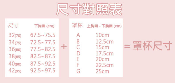 對的內衣的第一步,就是了解自己胸部的大小。就像鞋子要穿對尺碼,胸部當然也需要,我來告訴大家如何簡單的測量胸部吧!首先先拿出皮尺【公分】的那面來測量上胸圍跟下胸圍,上胸圍就是以乳頭為起點的水平方向,下胸圍就是胸部最下緣的地方。量出來的尺寸上圍減下圍的數字就可以知道自己是什麼罩杯囉!然後下胸圍就是你的尺寸