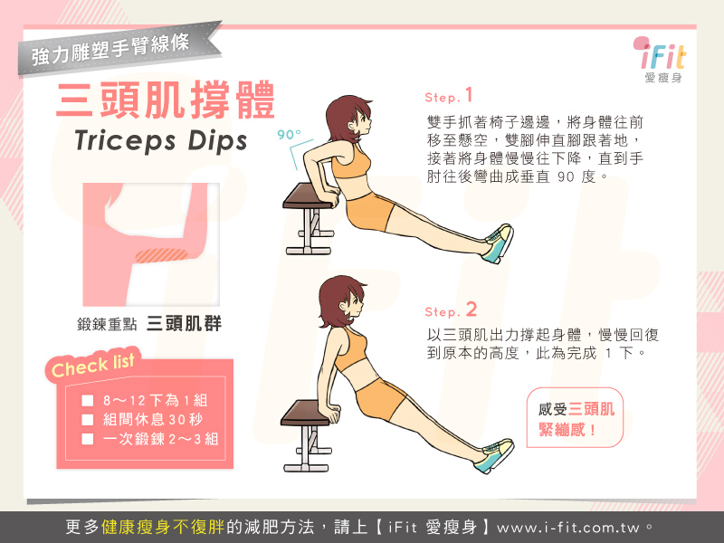 拿張椅子就上手1.找一張穩固的椅子,高度大約以坐在上面時大腿、小腿呈現 90 度為最佳高度。2.坐上椅子後,將雙手放在身體兩側的椅面上,抓著椅子邊邊,慢慢將身體往前移至懸空,用雙手支撐身體,雙腳伸直腳跟著地。3.將身體慢慢往下降,直到手肘往後彎曲成垂直 90 度;接著以三頭肌出力撐起身體,慢慢回復到原本的高度,此為完成 1 下。4.一組約做 8~12 下,一次做 2~3 組,組間休息 30 秒。若體能不足以讓手臂彎曲至 90 度,可以微微彎曲 30 度就好,待肌力提升後再慢慢將身體更往下降,循序漸進增加強度才安全喔!