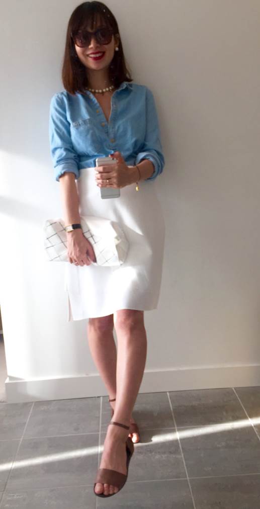 丹寧牛仔這麼流行,一定要來一下! 牛仔*白,本來就是經典,再換雙大地色涼鞋,最能帶動牛仔衣的精神。這種隨性的穿法,就算戴著珍珠項鍊、珍珠耳環,也不會老氣,請多使用。兩片式白色開岔裙/giordano ladies。