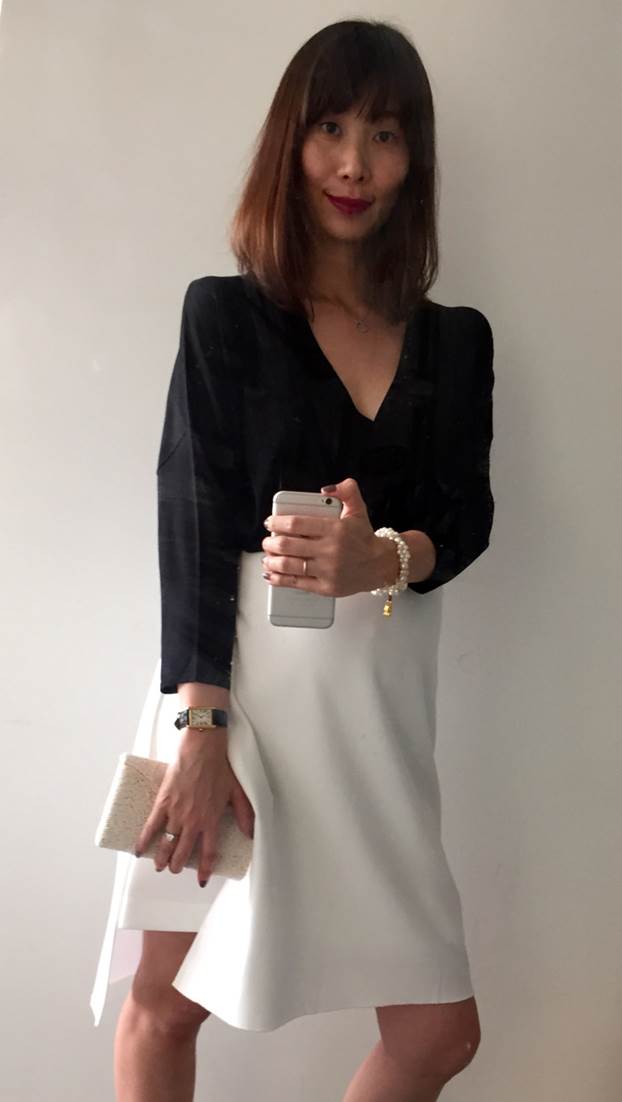 這件開襟外套,說真的掛在那超不搶眼,寬鬆沒腰身、下擺還一長一短…有點詭異。穿上後,意外有設計感。Oversize剪裁,試穿時,肩線夠合才對,不能有一絲垮肩,否則肩寬、下擺寬,碰一起又變大媽。釦子全扣滿、下搭任何白裙,故意不紮進去,穿帥氣踝靴(有點跟才不會矮短) ,嗯,設計師味道。黑不對稱開襟外套、白色開岔裙/皆為giordano ladies,白色珍珠手環/THOMAS SABO(結婚禮物,第一次戴,跟黑白很配,謝謝,XO)。今日唇膏,再度/NARS #VERMA,深紅莓色跟黑色衣服,超搭。