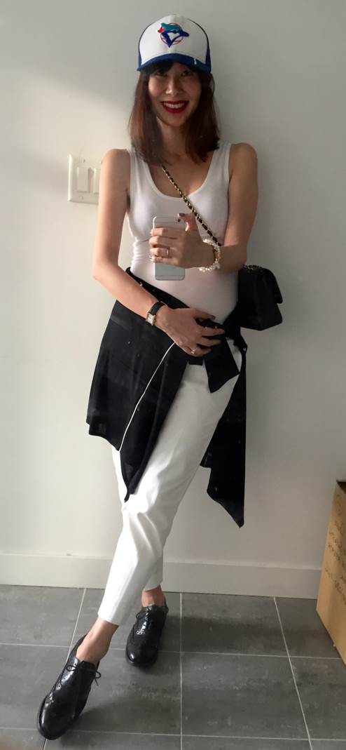 坦克+白褲,肚子很尷尬嗎? 拿出那件黑開襟外套綁在腰部,調整一下線條(盡量假裝隨性,別綁得太規矩,以免像登山),成功遮掩小肚肚&不太喜歡露出來的穿白褲臀部。白坦克背心、白九分褲、不對稱黑針織開襟外套/皆為giordano ladies,藍鳥隊棒球帽/多倫多名產。