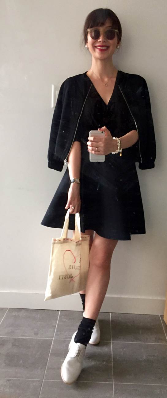 同上一套搭法,披上運動風外套,外套銀色拉鍊巧妙與V型胸線構成幾何線條,頭髮綁起來,整體線條更強勁。運動風外套、不對稱黑針織開襟外套、灰牛津鞋/皆為giordano ladies。
