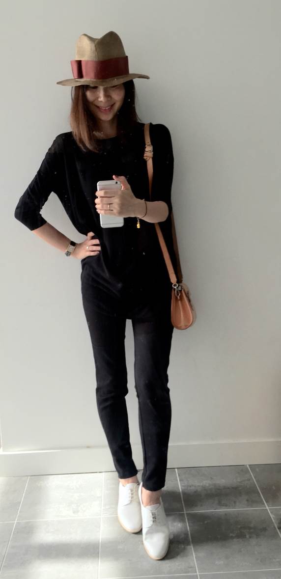保留黑針織罩衫,換上黑leggings,全身黑,這時閉著眼睛加任何顏色都好看,我偏好來點夏天的嬉皮風,換上駝色系的帽和包,整體多點瀟灑感。不對稱黑針織罩衫、合身Leggings、灰牛津鞋/皆為giordano ladies。帽/H&M