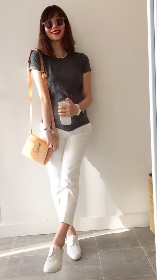 白*灰的組合,壓迫性降低、優雅感升高,圓領T與珍珠項鍊,天作之合。灰T/N年喀什米爾二手衣,白九分褲、灰牛津鞋/皆為giordano ladies。