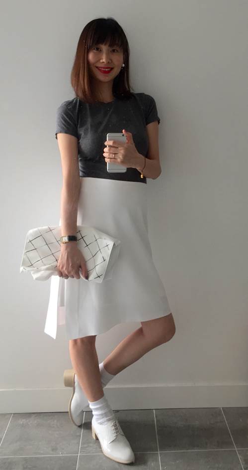 白裙搭配的基礎版,立馬降齡演出並兼顧端裝。白襪+白鞋也很夯,跟白裙呵成一氣,清爽感滿分。兩片式白色開岔裙、灰牛津鞋/皆為giordano ladies。