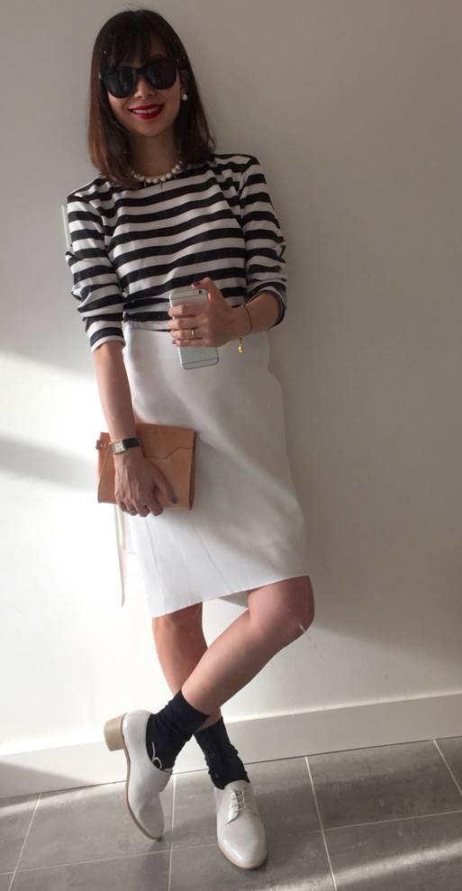 白條紋,穿牛津鞋或尖頭高跟鞋都可,只要加上黑色襪子,就能讓此造型經典有新力道,最後來串稍大顆的珍珠項鍊,增加潮味。兩片式白色開岔裙、灰牛津鞋/皆為giordano ladies,上衣/ZARA,珍珠項鍊/moussy。