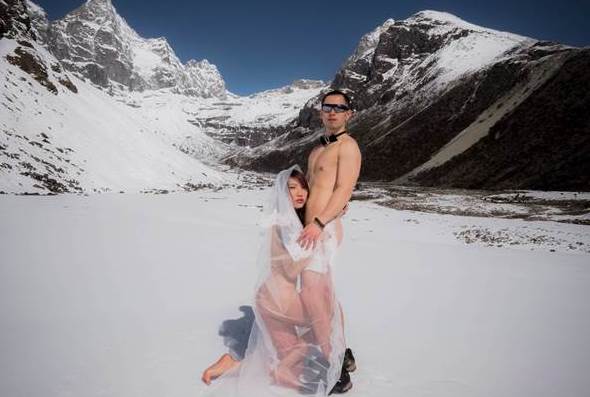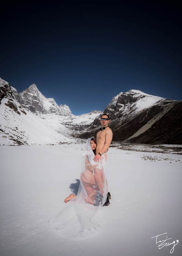 於是在跟老劉討論與了解了EBC路線之後,我突發奇想的跟他說:「既然我們都那麼喜歡喜瑪拉雅,不如我們就去那裡拍婚紗吧!」老劉很贊成我的想法。但是十幾天的徒步要帶的裝備很多,不可能真的扛一件婚紗上去,尤其這次的行程我們全程都靠自己,沒有嚮導也沒有背夫,所以裝備能精簡就精簡,更不可能帶好幾套漂亮衣服上去做服裝秀,從頭到尾就穿一件衝鋒衣、一件速乾褲,然後再帶個兩件速乾衣,沒了。於是最後我決定,那就裸體拍吧!婚紗扛不上去,但頭紗還可以。況且能在雪地拍婚紗已經很特別了,拍裸體婚紗不就屌炸天?最後終於拍桌定案,好!就這麼辦!