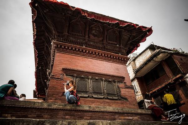 成群的鴿子像是漸層的灰色地毯,鋪滿整個佛寺屋頂。廣場上有很多小攤販兜售著讓遊客餵食鴿子的玉米粒;當地人好像不怎麼需要工作,四處都可以看到坐在石階上,無所事事聊著天的男男女女。我們停在杜巴廣場一會,拍拍照、查地圖,準備往旅客中心前進。一個賣砵的小販跑來跟我兜售,展示了一下他手裡那個會發出聲音的缽。我笑笑地拒絕了。