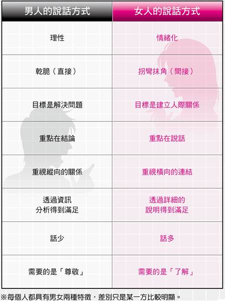 掌握男女二者的特徵與差異,就能依據不同的狀況,選擇適當的說話方式。小提醒「辯解」