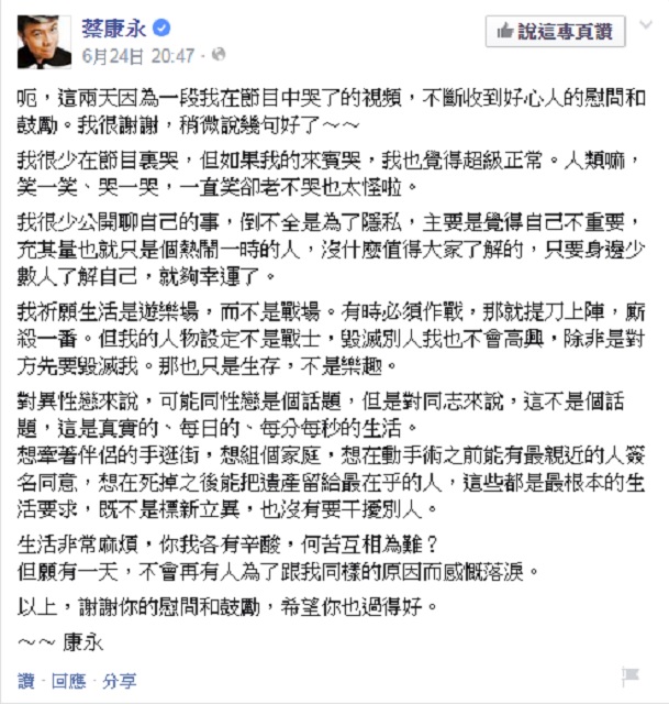 蔡康永日前在中國節目談到出櫃的心情,忍不住哽咽痛哭,他表示:「站在那個孤單的立場,我有時候希望有很多人陪我,不要每次提到這個題目的時候,只能亮出我一個人還活著,我們總得給那些爸爸媽媽看,你出了櫃不會死掉,不是每個出櫃的人都被社會逼到陰暗的角落,沒有路可以走。」讓許多人感動不已。蔡康永24號在臉書發文,「對異性戀來說,可能同性戀是個話題,但是對同志來說,這不是個話題,這是真實的、每日的、每分每秒的生活。想牽著伴侶的手逛街,想組個家庭,想在動手術之前能有最親近的人簽名同意,想在死掉之後能把遺產留給最在乎的人,這些都是最根本的生活要求,既不是標新立異,也沒有要干擾別人。」最後期許,「生活非常麻煩,你我各有辛酸,何苦互相為難?但願有一天,不會再有人為了跟我同樣的原因而感慨落淚。」