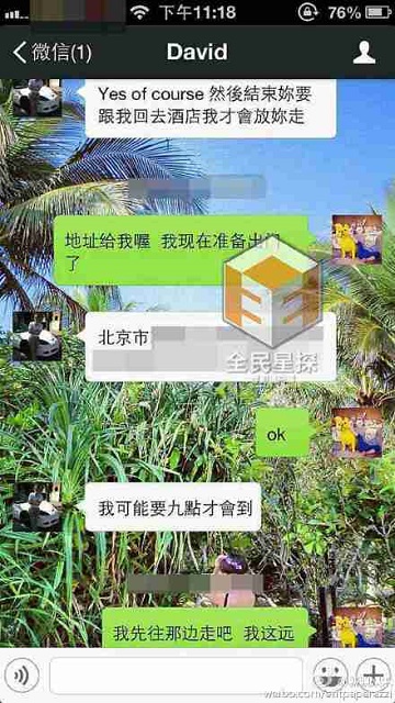 李威上周與中國女生楊子晴爆出私密照面,掀出過往情,但遭李威否認,說兩人並沒有交往過,今天中國媒體「全民星探」再度爆料楊子晴與去年才結婚的陶喆關係不單純,並拿出開房間等親密對話,有錄音檔與截圖,楊子晴受訪也坦承兩人有交往。根據報導,「二人在2010年相識於成都,之後頻繁聊天,言語挑逗極具曖昧,直呼楊子晴為寶貝,親愛的。楊子晴還現身爆出更多細節,稱陶喆婚後仍多次要求與其酒店私會。」