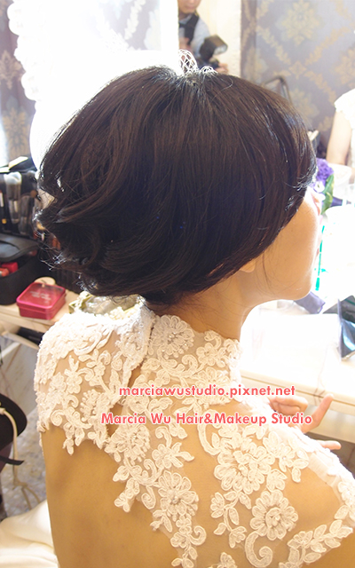 這個造型是將短髮以電棒製造出捲度之後,再將髮尾收起,雖然是短髮但也能擁有一般白紗的盤髮感,而且此款盤髮因為線條分明,也不會顯得過於僵硬死板!