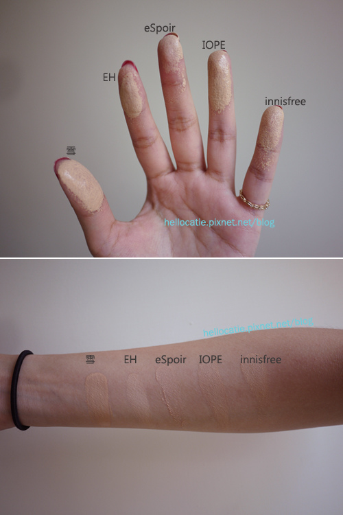 持久度: inni > 雪花秀 > EH > eS = IOPE基本上夏天我都是擦氣墊粉餅, 因為他們防曬係數都好高(都是50+ PA+++),擦上平常用的防晒再蓋上這粉餅我就會覺得自己防曬做的超徹底,整個很安心,而且氣墊粉餅上妝超級快!!薄薄撲一層就很美,手再殘都能打個完美底妝,比平常用粉底/BB雙抹半天來的方便多了。要如何挑選適合自己的呢~簡單來說, 如果妳膚質跟我一樣(中偏乾),雪花秀一定要買!!! 夏天室內用也OK,冬天用更完美,eSpoir雖然光澤也很美,但他會顯毛孔這點讓我很不爽,然後夏天要出外走跳的話可以多買一個EH補充裝, 或是innisfree。不過中乾肌用EH或是innisfree一定要記得加強保濕~~膚質中偏油的話EH應該會很適合你, 雪花秀可以冬天再買,而innisfree(持久款)是爆油肌的救贖, 不認識innisfree這顆的人才會說爆油肌不能用氣墊粉餅。::::::::::::::::::::::::::::::::補充說明::::::::::::::::::::::::::::::::