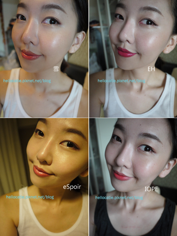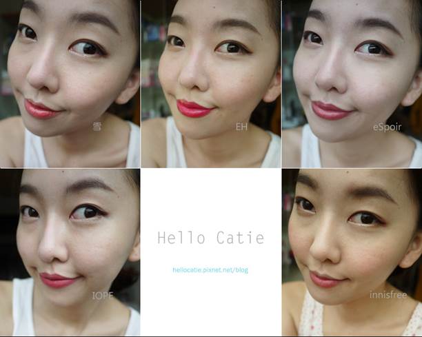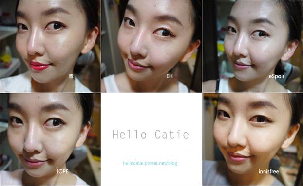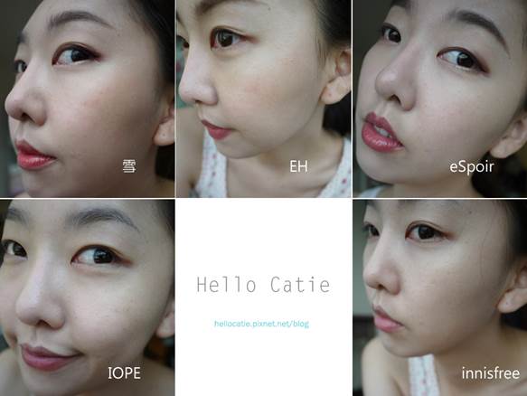 可以看到雪花秀機~乎~沒有脫妝, 氣色一樣好,光澤一樣美,Etude House光澤跑光光, 稍微有點脫妝, 而且氣色不是很漂亮,eSpoir整個臉灰掉….IOPE光澤跑光光而且脫妝脫到我好像沒有化妝,所以對於很多人說偏油肌適合IOPE這點我非常存疑….硬要比的話EH比較不會脫妝, 會更適合偏油肌,innisfree根本沒有脫妝!!!而且擦innisfree這天我可是在外面走跳了一下午,經過持久度測試之後innisfree完全逆轉我之前對他的印象,雖然他光澤很弱(根本是沒有),但一擦上就很吃妝而且遮瑕力不錯,妝效也自然,然後居然無敵持久,innisfree這顆蠻推薦給平常習慣用一般粉餅或是無敵大油肌的妞們。