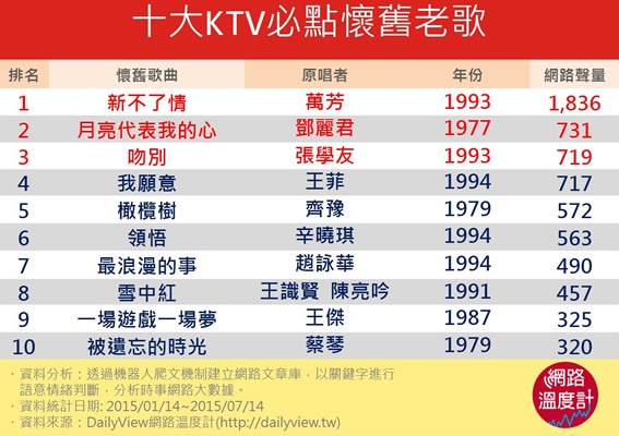 無論歌壇有多少新人來舊人去、流行的曲風如何瞬息萬變,就是有那麼一些歌曲,經歷了十年、二十年,甚至更長的歲月,都在眾人的心中佔有一席之地,甚至成為不同世代間的共同語言、溝通的橋梁。究竟是怎樣的動人歌詞或雋永旋律,可以在樂壇中屹立不搖數十年?究竟有哪些歌是讓你無論在錢櫃、好樂迪或是投幣式KTV都想點來唱的經典懷舊金曲?今天,DailyView網路溫度計就要來揭曉十大網友們最琅琅上口也最難以忘懷的KTV必點懷舊歌曲,這些歌皆已有二十年以上的歷史,伴我們走過人生大小階段,快來看看你是否都會唱吧!No.10 被遺忘的時光