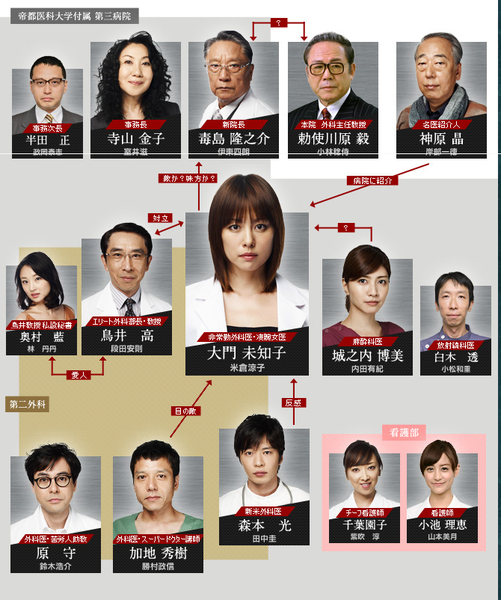 這部劇裡面的演員也都是很常見的,女主角(左三) 米倉涼子 我覺得他每次演戲都像一個不同的人 我有時候都認不出來 😛左一 : 遠藤憲一(也有演 DR.倫太郎)