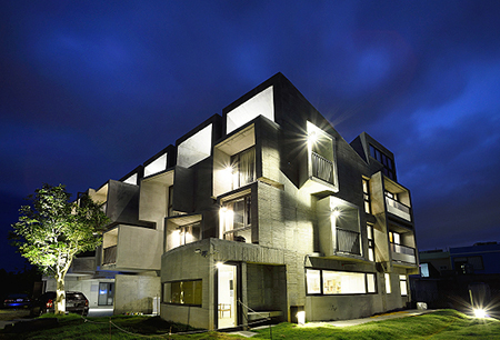 位於墾丁的「光現旅宿」,就像是一顆巨型的水泥魔術方塊,整棟建築以類清水模的工法建蓋,運用自然石材、原木、玻璃等元素構成。以光為鄰的概念做為整棟建築的設計重心,讓自然光影與框景互動創造出不同時段的採光變化。