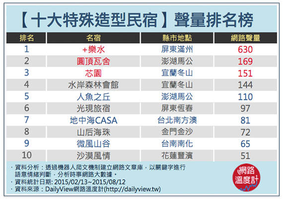 好山、好水、好地方,台灣就是福爾摩沙!繼上回報導「全台最美十大仙境名宿」,發現台灣美麗民宿愈來愈多,不僅環境要詩情畫意,房內得住得舒心,連建築物本身都要靠「外表」取勝!不夠特別?OUT!OUT!在台灣就有民宿業者把房子蓋成圓形,或是像水管一樣的房間,也有人看膩四四方方的屋子,選擇以不規則狀的屋頂和窗台營造不一樣的特色,甚至有主人斥資千萬蓋一座城堡民宿,藍白相間風格仿效地中海情調。今日DailyView網路溫度計就來個全台大偵查,將網友心中最特別的民宿全部搜羅出來!下次小旅行是否想要一個不一樣的選擇?不用出國看高第,文章看下去就對啦!十、沙漠風情