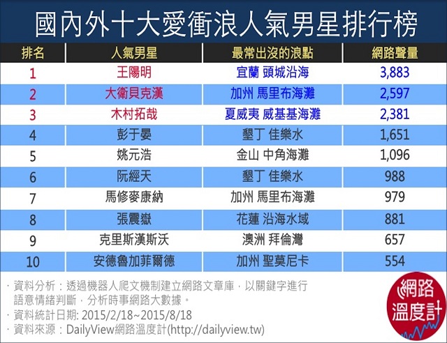 「衝浪」這項源自於太平洋玻里尼西亞人(Polynesia)的極限水上運動,發展至今已有兩百多年的歷史,在最古老的衝浪文化中,部落的酋長絕對是技術最好的駕浪者,可以擁有最好的衝浪板與浪最好的海灘。衝浪帶給衝浪者的樂趣往往是短暫而難以言喻的瞬間,但偏偏站在浪頭上的駕乘快感又好像沒有別的東西可以取代,這就是大海讓人著迷的美妙所在。近年來,國內為衝浪運動著迷的人口越來越多,演藝圈裡愛衝浪成痴的男藝人比比皆是;每到夏天北部的宜蘭海邊或是南部的墾丁海岸,也總是吸引著許多年輕朋友前往玩水學衝浪。今天DailyView網路溫度計就特別統計了國內外網友心目中愛衝浪的人氣男星行榜,相信在看完今天的排名之後,你一定也跟小編一樣,想迫不及待的跑去海邊衝浪,或是給浪衝一下也不錯啊!第十名:安德魯・加菲爾德好萊塢新生代男星「蜘蛛人」安德魯加菲爾德(Andrew Garfield),今年年初因來台拍攝大導演馬丁史柯西斯的新電影「沈默」,傳出在台灣夜店大搞一夜情,導致正牌女友艾瑪史東(Emma Stone)憤而提出分手而名噪一時,當然也在鄉民界引起一陣軒然大波。不過就算外界有再多的紛紛擾擾,仍然阻止不了加菲爾德投入大海的懷抱!經過今年在台灣工作的long stay之後,他在離台前說過最難忘的就是春節假期時在墾丁四天的衝浪時光;私底下熱愛衝浪的他,去年也曾被拍到遠赴澳洲指導自閉兒學習衝浪運動。過去加菲爾徳與艾瑪史東感情正濃時,兩人一起衝浪的足跡更是遍佈夏威夷與加州各大知名海灘,可以說是貨真價實的海灘男兒喲!第九名:克里斯,漢斯沃「雷神索爾」克里斯漢斯沃(Chris Hemsworth),自出道以來便以粗獷的男子氣概還有傲人的健美身材風靡全球女性粉絲。來自澳洲墨爾本的他,從五歲就開始衝浪,據說還沒出道前的志願 就是當個每天泡在海裡的衝浪選手,是受到演員哥哥路克漢斯沃(Luke Hemsworth)的鼓勵才轉往演藝圈發展。如今克里斯漢斯沃在娛樂圈已經取得了巨大的成就,但始終鍾情於衝浪的他,今年帶著妻子與三名子女搬離紙醉金迷的好萊塢生活,舉家定居在澳洲知名的衝浪勝地拜倫灣(Byron Bay),讓他閒暇時就能衝向大海的懷抱,用他最愛的衝浪板與各式優美的動作,在浪頭上劃出一道又一道漂亮的弧線。第八名:張震嶽