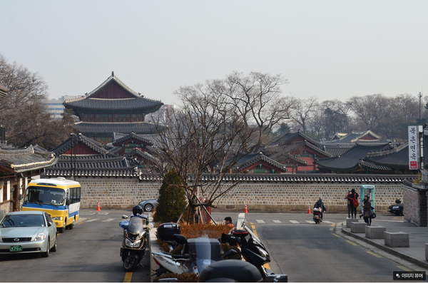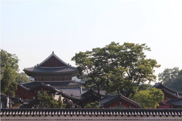 從這裡首先可以看到重建的奎章閣一帶及舊璿源殿,另外還可看到仁政殿的側面。