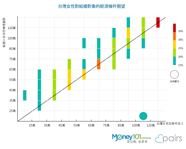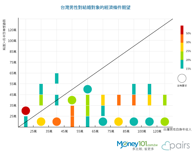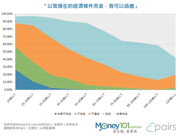 Money101.com.tw與由日本引進台灣、擁有百萬名使用者的戀愛結婚交友APP派愛族(Pairs)共同進行「結婚意向大調查」研究,顯示出多數男女認為,自己應該要有55萬至65萬年薪,才是可以結婚的收入。