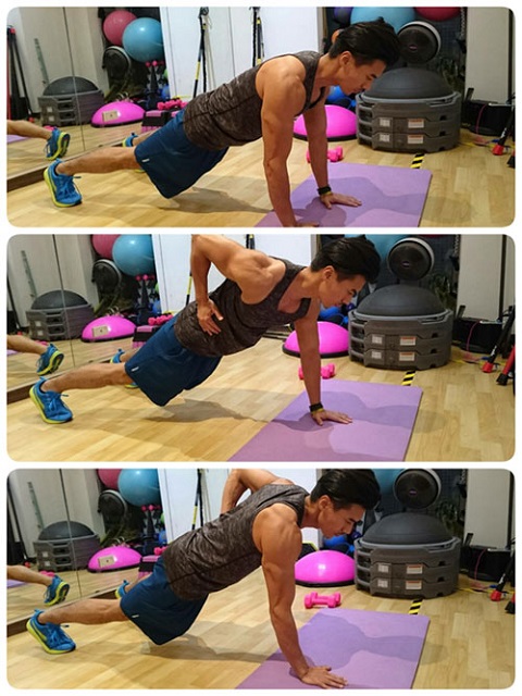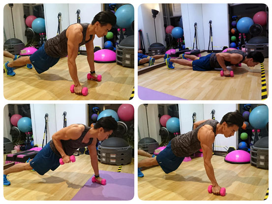 增加難度:腹部收緊,保持核心出力身體不過度晃動,做一次伏地挺身後,雙手輪流拿啞鈴至腰部位置。