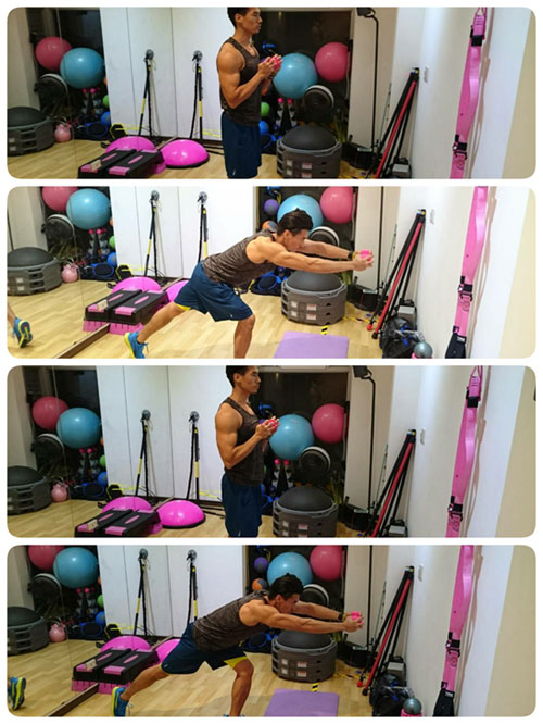 啞鈴運用:背部挺直,身體前傾,雙手持一個啞鈴往前伸直,單腳蹲,同時往後以腳尖踩,再站起換腳做動作。