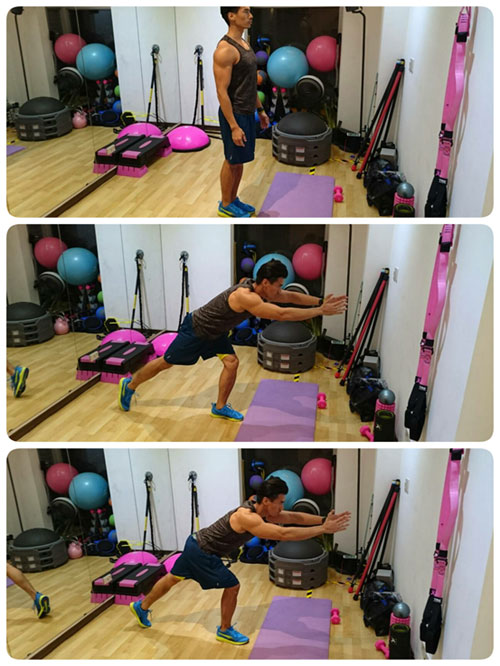 基本徒手:背部挺直,身體前傾,手往前伸直,單腳蹲,同時往後以腳尖踩,再站起換腳做動作。