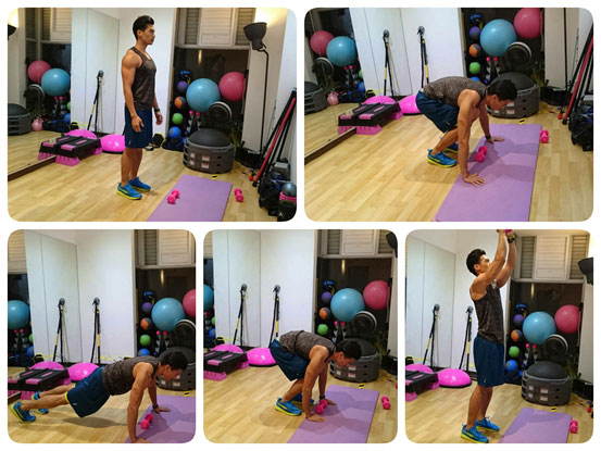 啞鈴運用:站立往下雙手撐地往後跳,跳回來後馬上拿起啞鈴站起,放下啞鈴雙手撐地,再往後跳,重複動作。
