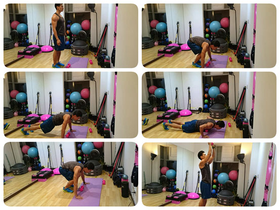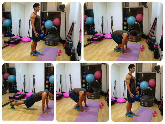 基本徒手:站立往下雙手撐地往後跳,跳回來後馬上站起,重複動作。