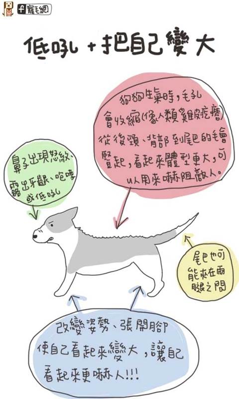 特別是狗狗露出牙齦的時候,就表示非常不開心了!(而且看起來好可怕)3. 豎毛4. 把腳打開,讓自己看起來更大!