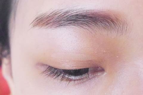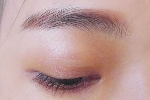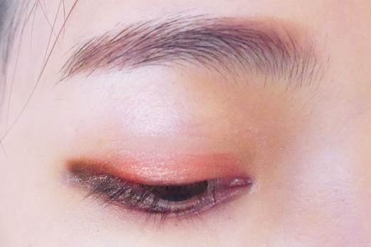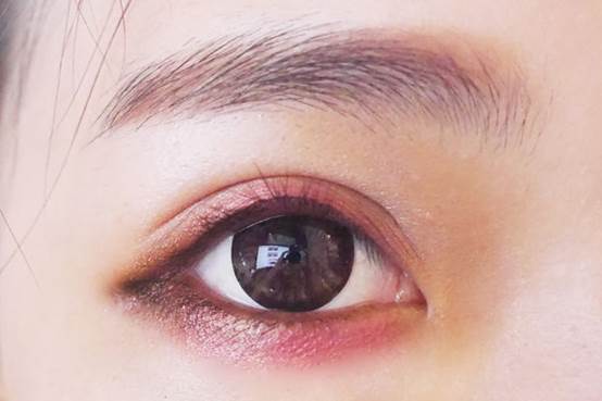 來看看開閃光燈的樣子,很清楚的可以看到眼妝主要是由酒紅、紅、咖啡、金這些色系所組成,因為層層不同顏色的堆疊,也營造了一點小臥蠶感。