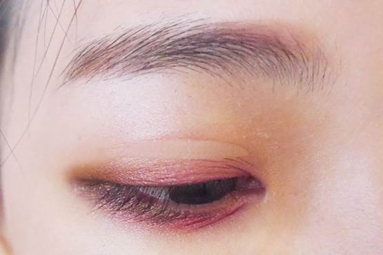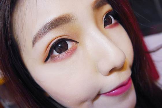 上眼尾也用酒紅色眼影帶到