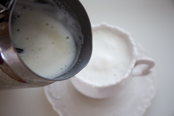 1. 新鮮豆漿加糖,用奶泡機打出奶泡,若無奶泡機可直接小火加熱但不要煮滾